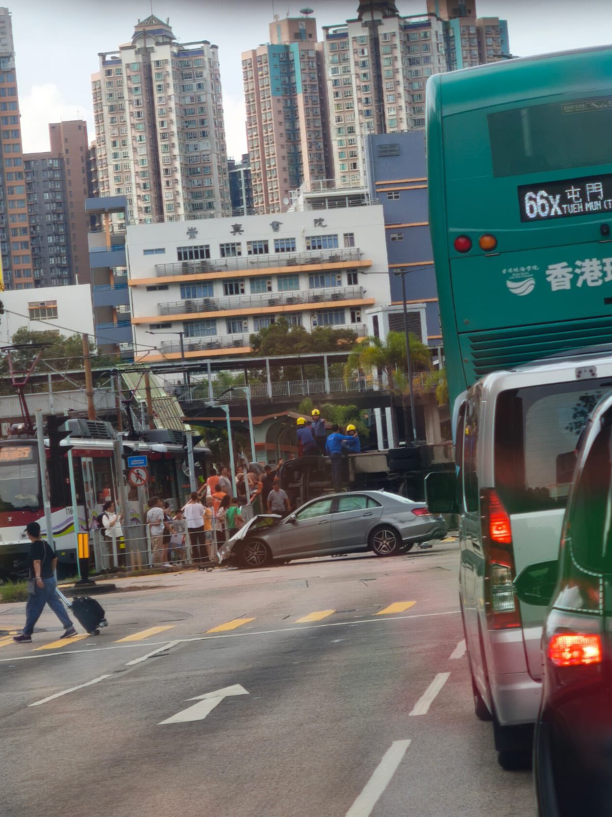 屯門今午(24日)發(fā)生交通意外。下午3時多,一輛私家車沿鳴琴路往良景邨方向行駛,在輕鐵石排站對開與一輛消防車猛烈碰撞,及後消防車翻側(cè),至於私家車車頭嚴(yán)重?fù)p毀。意外造成7人受傷,包括5名消防員、私家車男司機及男乘客,傷者都屬輕傷?,F(xiàn)場多名熱心市民爬上消防車,協(xié)助消防員離開。