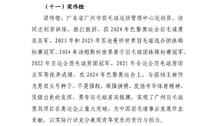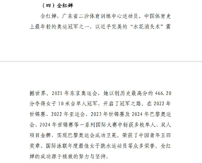 9月30日,廣東省體育局官網(wǎng)公示全國體育系統(tǒng)先進(jìn)個人擬推薦名單,13名運動員入選,包括全紅嬋、陳藝文、謝思埸、梁偉鏗、王柳懿、王芊懿、王欣瑜等。
