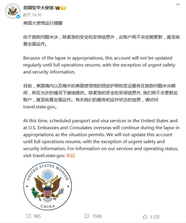 據(jù)公告,目前,美國境內(nèi)以及海外的美國使領(lǐng)館的預(yù)定護(hù)照和簽證服務(wù)在撥款問題未決期間,將在允許的情況下繼續(xù)提供。除緊急的安全和安保信息外, 美國駐華大使館將不會更新賬戶,直至恢復(fù)全面運(yùn)作。