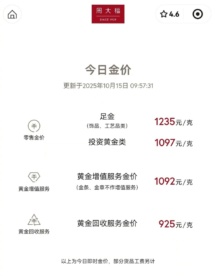 受金價上漲影響,15日國內(nèi)金飾克價繼續(xù)上調(diào),周大福足金首飾價格由前日的1215元/克上漲至1235元/克,一夜大漲20元;周生生足金首飾價格由前日的1213元/克上漲至1227元/克,一夜大漲14元;老鳳祥足金首飾價格由前日的1206元/克上漲至1230元/克,一夜大漲24元。