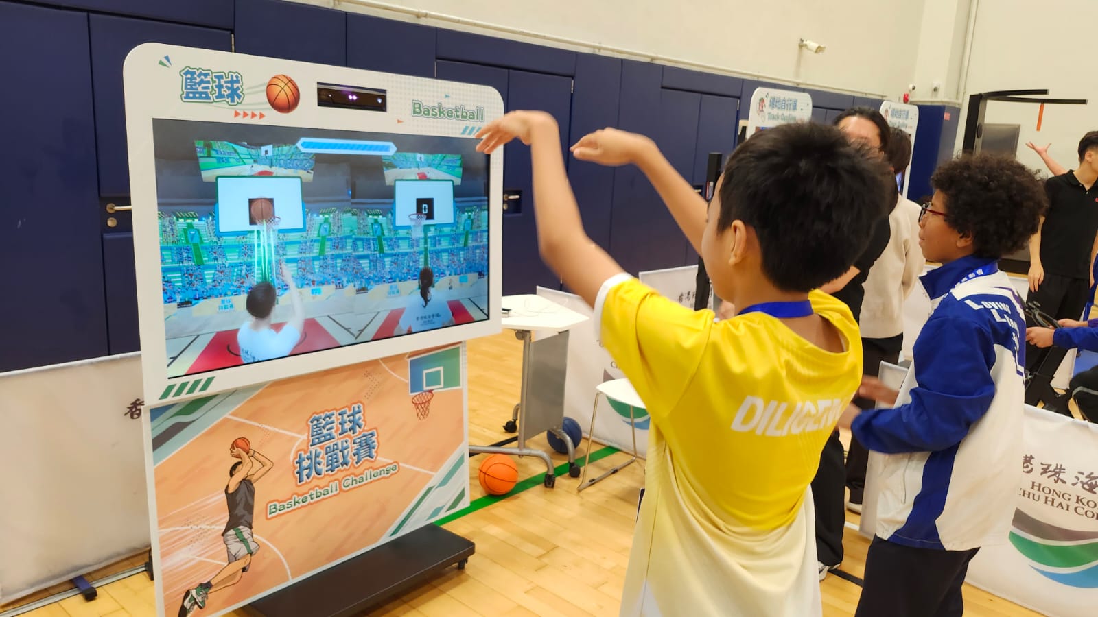 學(xué)生到攤位試玩籃球。