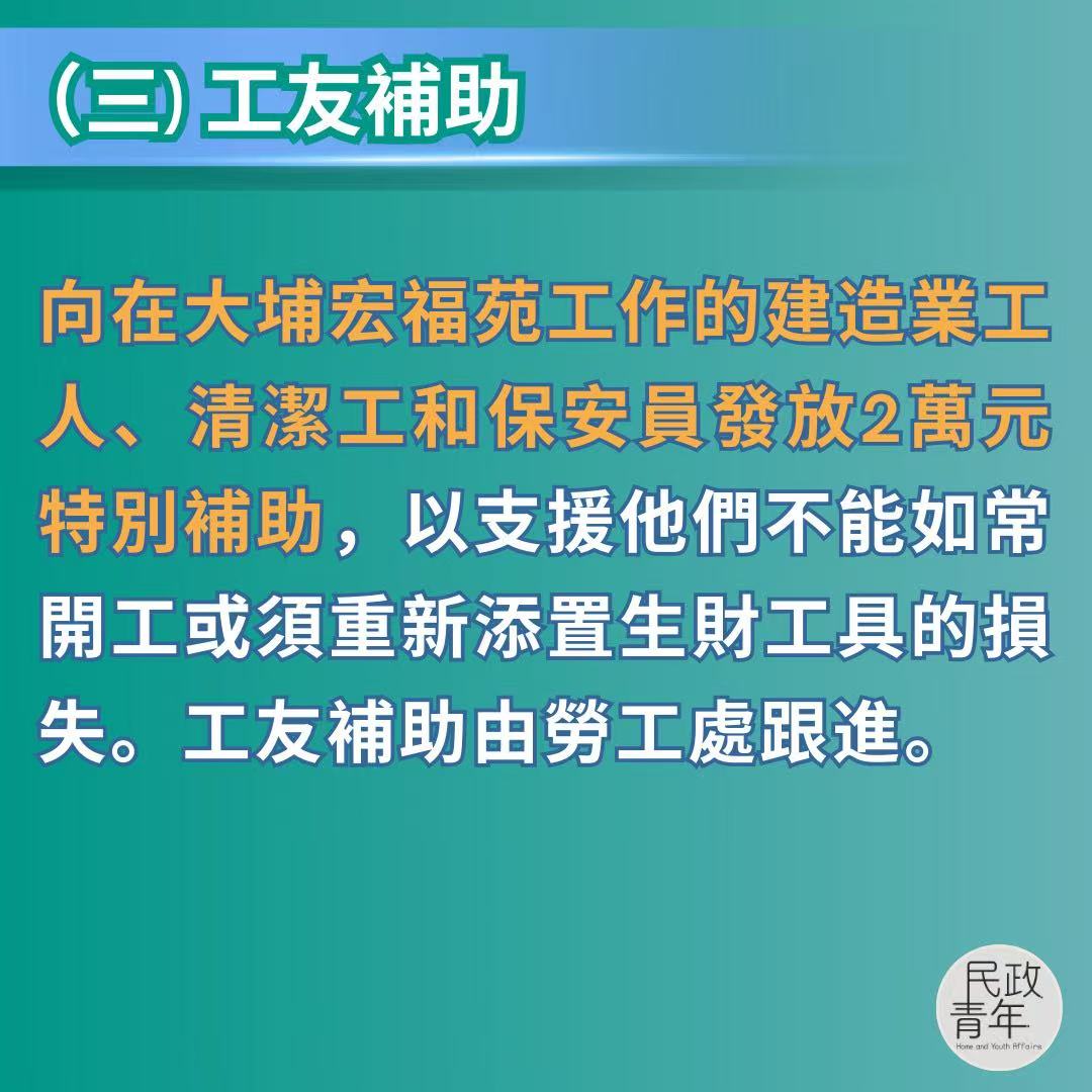 其三,在大埔宏福苑工作的建造業(yè)工人、清潔工和保安員會獲發(fā)放2萬元補助,以支援他們不能如常開工或需重新添置生財工具的損失。補助由勞工處跟進。
