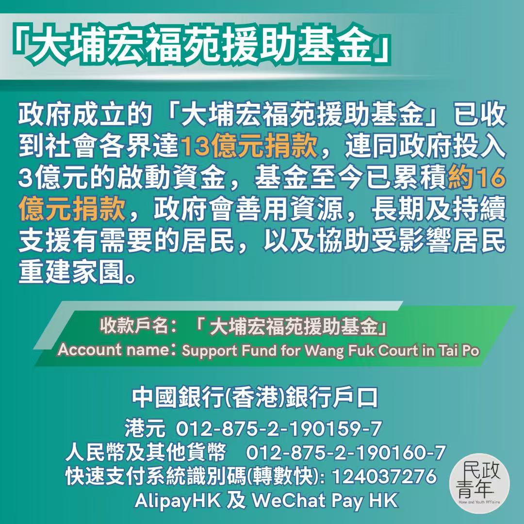 政府成立的「大埔宏福苑援助基金」已收到外界捐款達13億元,連同政府投入的3億元啟動資金,基金總額約有16億元,會用在協(xié)助居民重建家園,提供長期和持續(xù)的支援。