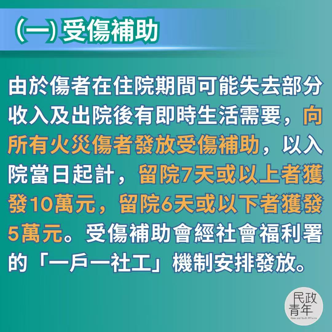 除上述慰問金、殮葬金、生活津貼,以及早前發(fā)放的1萬元應急補助金,政府會再發(fā)放四項特別補助。其一,所有火災傷者可獲發(fā)受傷補助,以入院當日起計,留院7天或以上者獲發(fā)10萬元,留院6天或以下者獲發(fā)5萬元。受傷補助會經(jīng)社會福利署的「一戶一社工」機制安排發(fā)放。