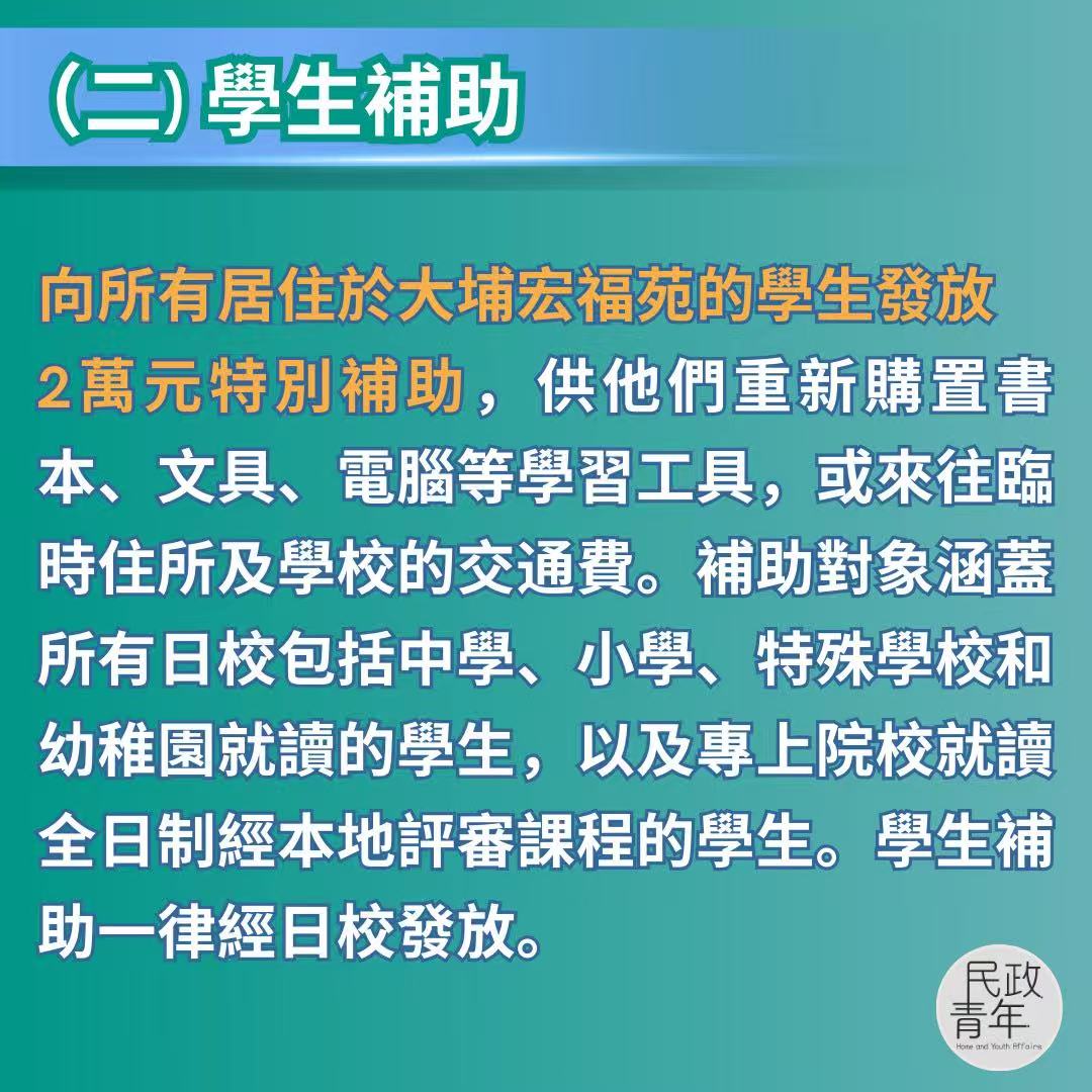 其二,所有居于大埔宏福苑的學生會獲發(fā)放2萬元補助,對象涵蓋所有日校包括中學、小學、特殊學校和幼稚園學生,以及專上院校就讀全日制經(jīng)本地評審課程的學生。補助一律經(jīng)日校發(fā)放。