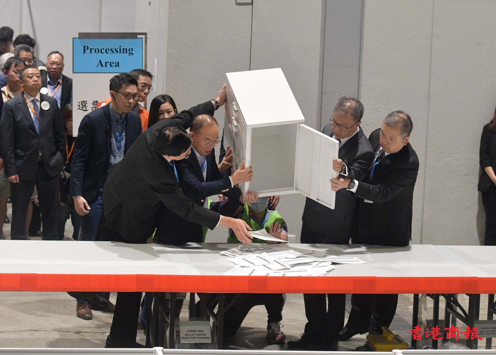 12月7日晚上11時(shí)40分,選舉管理委員會(huì)主席陸啟康與政制及內(nèi)地事務(wù)局局長(zhǎng)曾國(guó)衞,在灣仔會(huì)展中心中央點(diǎn)票站倒出票箱內(nèi)的選票,工作人員分類和點(diǎn)算選票。記者 崔俊良攝